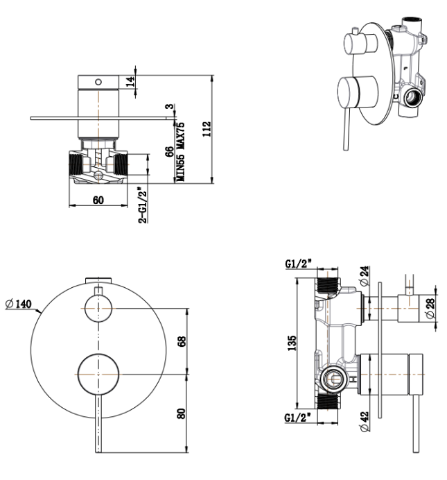 Mica Shower Mixer Diverter – 2P – TRIM KIT ONLY